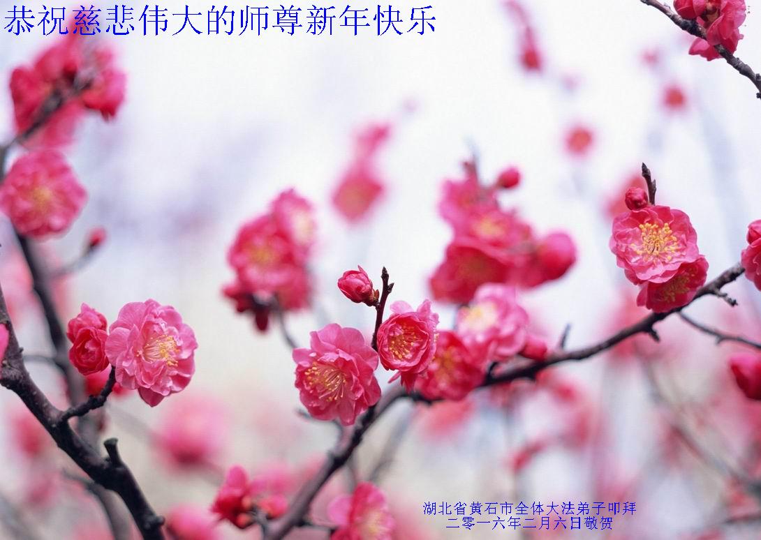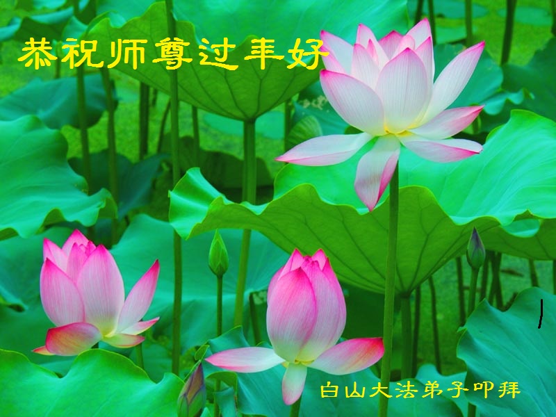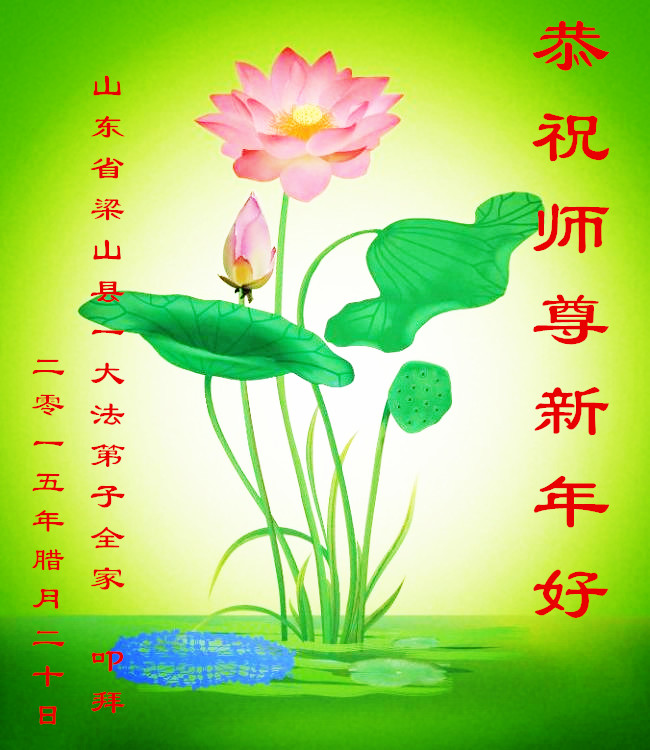 新年颂师恩 爆竹一声辞旧岁,春回大地万象新; 天清体透乾坤朗,大穹再造颂师恩。 鹤飞凤舞仙乐起,法正洪穹除旧尘, 人间喜迎新春至,亿万梅莲拜师尊。 新春佳节同庆贺,十方同颂主洪恩! 长春大法弟子 长春大法弟子全家恭祝师尊新年快乐!感谢师尊的慈悲救度,您辛苦了!(双手合十叩拜) 山东省淄博市大法弟子恭祝慈悲伟大的师尊新年快乐!