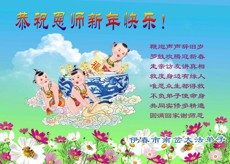 鞭炮声声辞旧岁 罗鼓欢腾迎新春 走亲访友讲真相 救度身边有缘人 惟愿众生都得救 不负弟子使命身 共同实修多精進 圆满回家谢师恩 黑龙江省哈尔滨学法小组大法弟子恭祝师尊新年好!