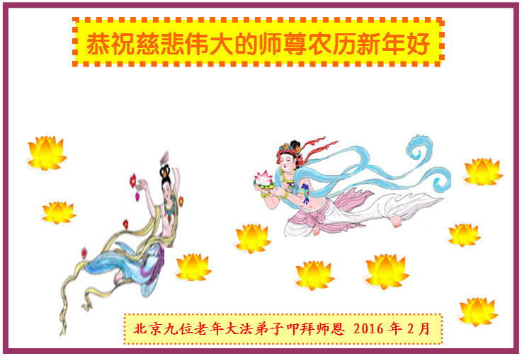 北京九位老年大法弟子给慈悲伟大的师尊拜年:恭祝师父新年好,师父新年快乐!