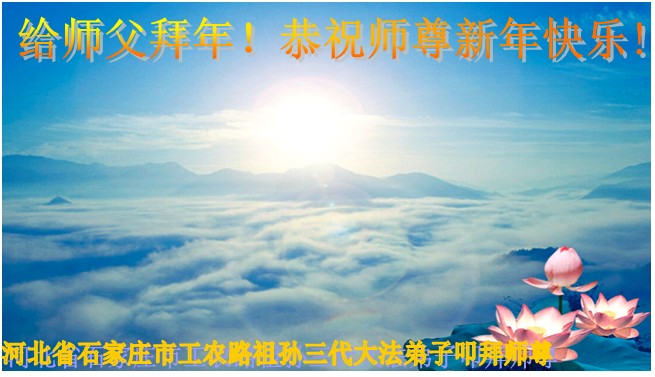 师父新年好! 师父辛苦了,在过去的一年里师父时时处处保护着弟子、点悟着弟子,返本归真,同化大法多救人,在新的一年里弟子们一定记住师父的话,学好法多救人,做好三件事,勇猛精進。新宾县大法弟子 河北石家庄大法弟子恭祝师父新年好!