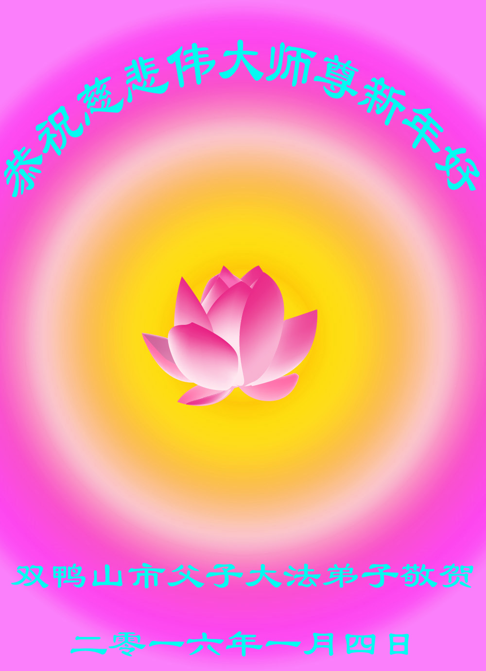 师尊辛苦了!谢谢师尊的救度! 师恩大于天 穹体无限大,师尊慈悲洪。 众生无量计,师尊救大穹。 经历万般苦,师尊正法成 法徒遍世界,师尊度众生。 赦免三界罪,师尊替担承。 众生快醒悟,师尊已久等。 不计众生过,正法见分明。 善恶自己选,留灭自己定。 世人快清醒,真相破谜蒙。 三:退.保平安,时间不久等。 黑龙江省双鸭山市全体大法弟子敬贺 二零一六年一月四日 黑龙江省双鸭山市父子大法弟子恭祝师尊新年快乐!