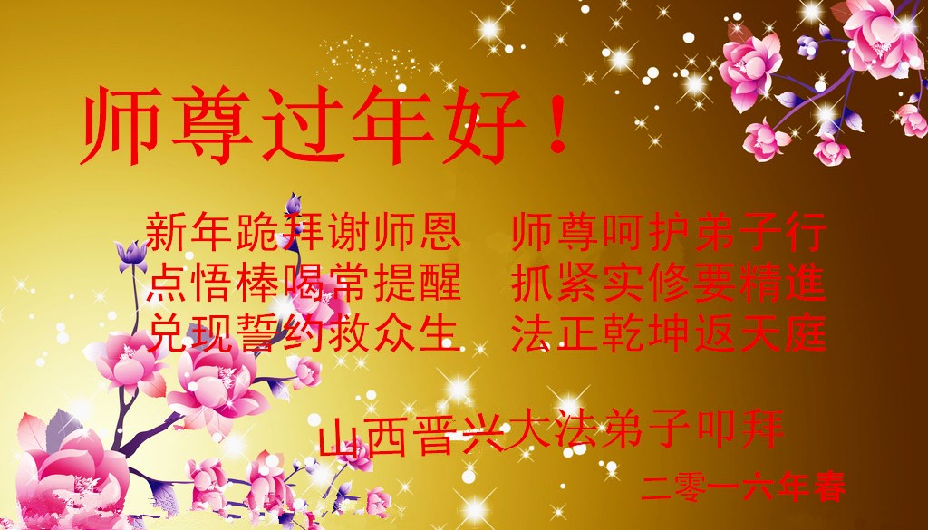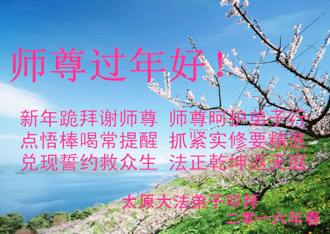 师尊您辛苦了! 谢谢师尊为大法弟子所做的一切!颂不尽的佛恩浩荡,写不尽的沧桑与辉煌。我们会更加珍惜这瞬间即逝的宝贵时光,精進做好三件事,广传真相,修好自己,不辜负师尊的慈悲救度。 广东省茂名市大法弟子 二零一六年二月四日 一被迫流离失所在外的大法弟子恭祝慈悲伟大的师父新年快乐!