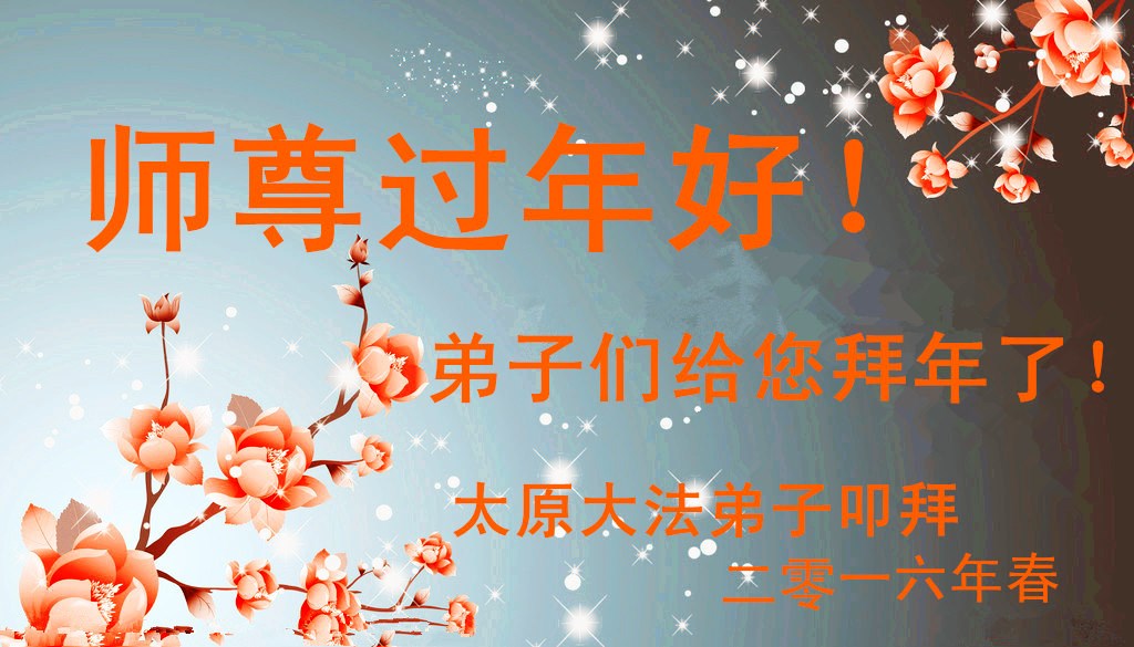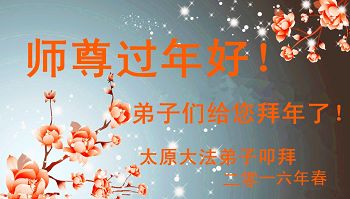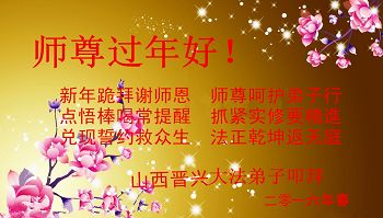 中国传统佳节新年到了, 弟子们在大陆遥祝师尊新年快乐!感恩师尊对弟子们的救度,弟子坚定的 信师信法, 做好三件事多救人,跟恩师回家! 向师尊跪拜 2016年2月4日 辽宁阜新大法弟子恭祝师尊新年快乐!