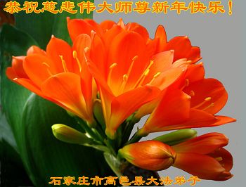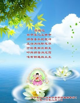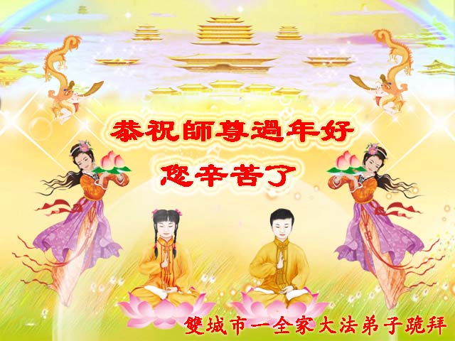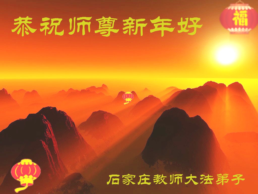 尊敬的师父过年好: 多少千年的宇宙之谜是您,我们最伟大的师尊,揭开了这遥远的历史,它最神秘的面纱,把宇宙的极高法理“真善忍”第一次传给了人,清楚的指明了生命的意义和前程,也才有了当今大法弟子开始的真正觉醒和神圣使命,您的大法弟子们无论付出了什么,都无法感激您的无量恩赐。 弟子叩拜师尊 抚顺市新宾县大法弟子 河北省石家庄教师大法弟子祝福师尊过年好!