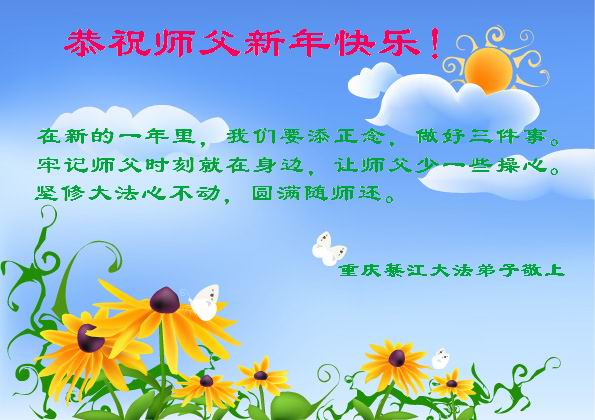 在新的一年里,我们要添正念,做好三件事。牢记师父时刻就在身边,让师父少一些操心。坚修大法心不动,圆满随师还。 重庆綦江大法弟子敬上 辽宁抚顺大法弟子敬祝师尊过年好!