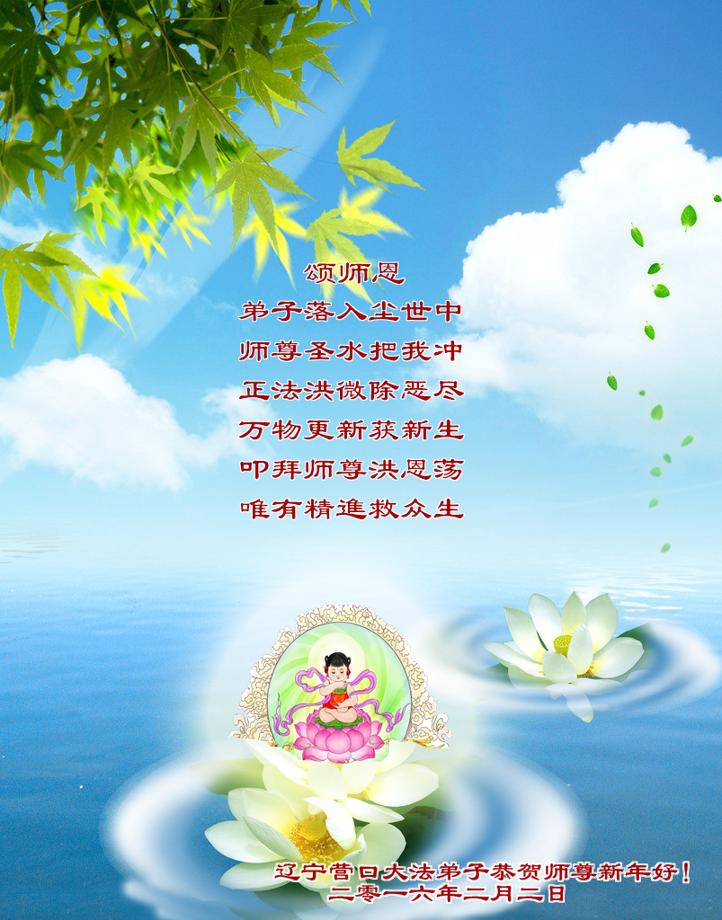 颂师恩 弟子落入尘世中 师尊圣水把我冲 正法洪微除恶尽 万物更新获新生 叩拜师尊洪恩荡 唯有精進救众生 辽宁营口地区大法弟子恭贺师尊新年好!