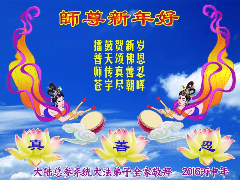 师尊:想说的话很多,中国的文化很丰富,却找不出能表达弟子感激的词句,只能在新年来临之际,弟子代广东省司法系统大法弟子祝师尊新年快乐! 大陆一法官全家跪拜恭祝慈悲的师尊2016年皇历新年快乐!