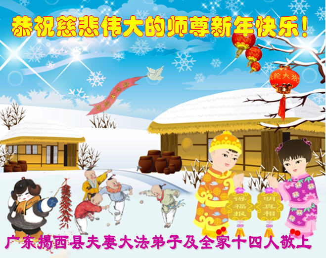 广东省揭阳市揭西县夫妻大法弟子及全家十四人恭祝慈悲伟大的师尊新年快乐!
