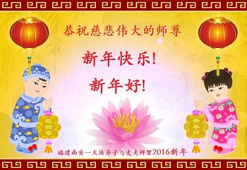值此新年来临之际,我们向慈悲伟大的师父表示深深的感恩! 谢谢师父保护与加持,使弟子闯过魔难、在过关中心性得到升华,师父赐予弟子“向内找”的法宝,使弟子在魔难中清醒、理悟。在新的一年中,弟子要更加精進,走正师父安排的路,惟愿师尊笑! 甘肃兰州大法弟子 乙未年除夕 福建南平全体大法弟子恭敬慈悲伟大的师父新年好!