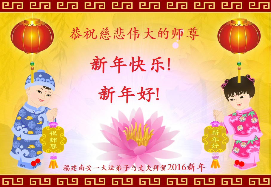 弟子唯有精進实修,努力赶上!谢谢师尊的细心呵护,以及对弟子的慈悲、宽容,在新的一年里走好走正自己的路,不再留遗憾! 福建省泉州市南安市一大法弟子与丈夫恭祝师尊新年快乐!