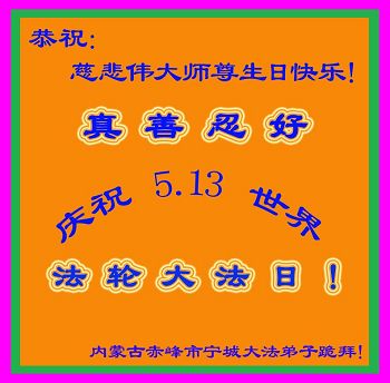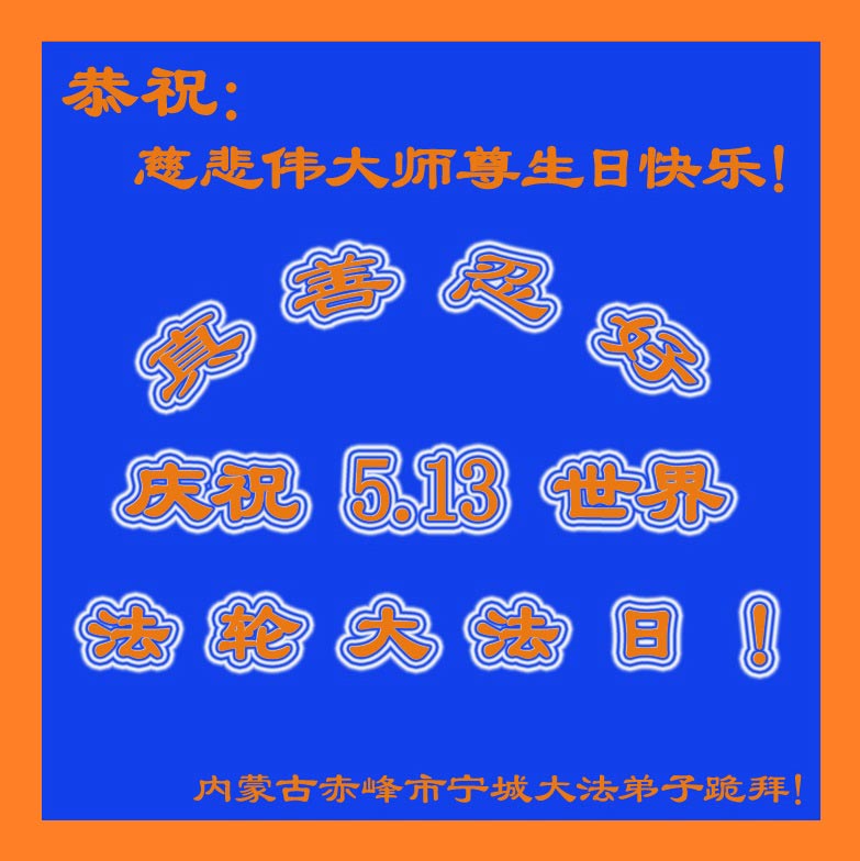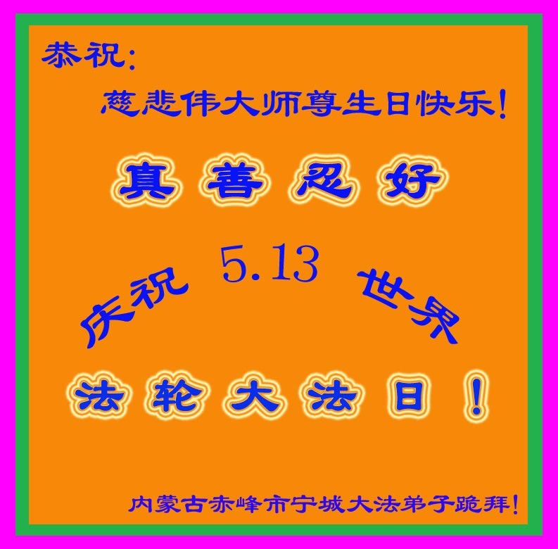 在普天同庆的日子里,我们向师父说:谢谢您伟大的师父!师父辛苦了!盼望师父早日回来! 内蒙古赤峰宁城大法弟子恭祝慈悲伟大师尊生日快乐!普天同庆5.13世界法轮大法日!