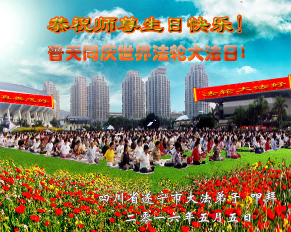 四川省遂宁市大法弟子恭祝慈悲伟大的师尊生日快乐!普天同庆世界法轮大法日!