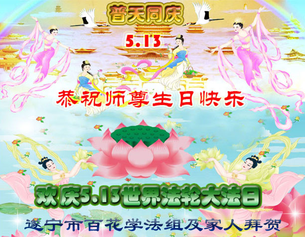 四川省遂宁百花学法组大法弟子及家人恭祝慈悲伟大的师尊生日快乐!普天同庆5.13世界法轮大法日!