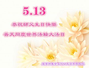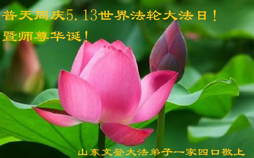 山东省威海市文登市大法弟子一家四口普天同庆师尊华诞暨5.13世界法轮大法日!