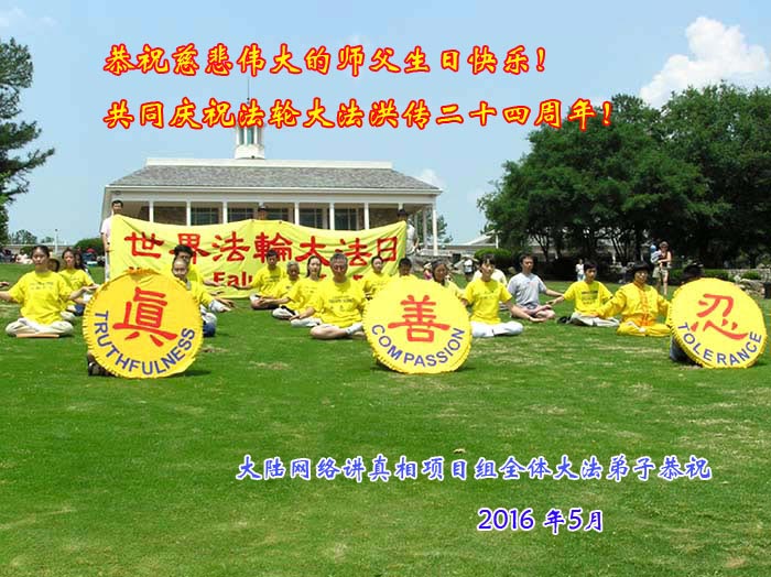 大陆网络讲真相项目组全体大法弟子恭祝慈悲伟大的师父生日快乐!共同庆祝法轮大法洪传二十四周年!