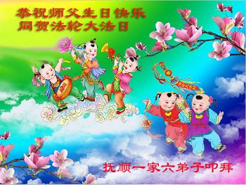 辽宁省抚顺一家六大法弟子恭祝师父生日快乐!同贺法轮大法日!