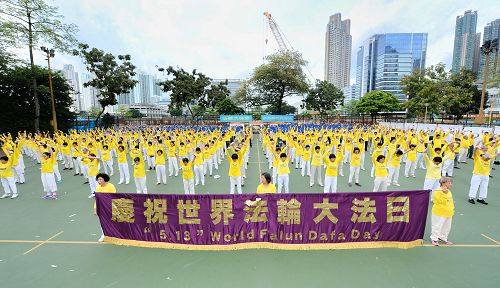 二零一六年五月八日,香港法轮功学员在长沙湾举行集会及游行,庆祝即将到来的第十七届“世界法轮大法日”暨法轮功创始人李洪志先生华诞,庆祝法轮大法弘传世界二十四周年。来自海外多个国家和地区的法轮功学员,赶赴香港同庆同贺。  图2-4:法轮功学员在长沙湾游乐场举行集体大炼功及表演,向法轮功创始人李洪志先生贺寿,并庆祝世界法轮大法日。 |