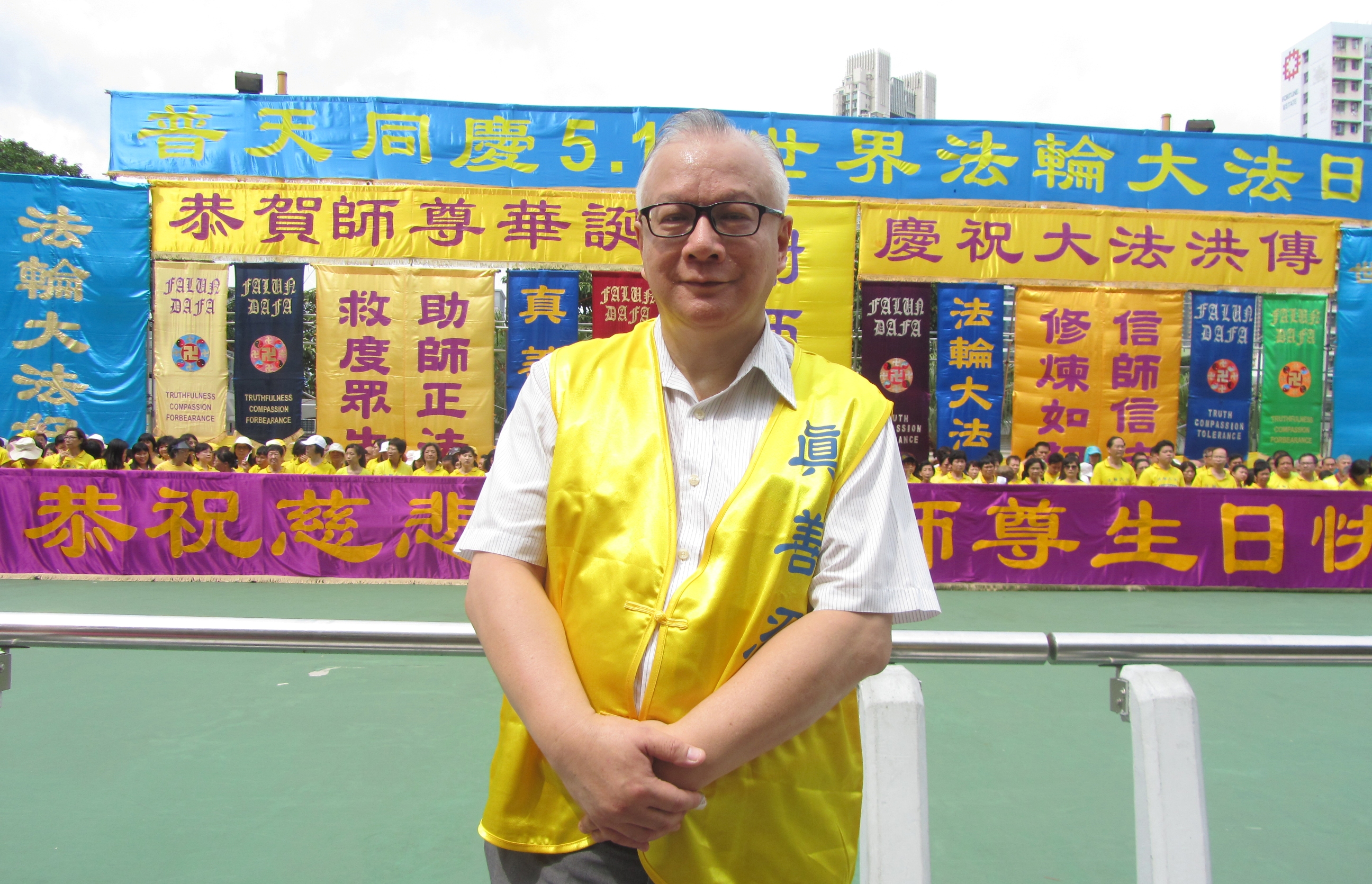 上午,法轮功学员在在九龙长沙湾游乐场集体炼功,展开一天的庆祝活动。接着天国乐团演奏“法轮大法好”、“法轮圣王”、“佛恩圣乐”、“神圣的歌”等多首乐曲,然后是腰鼓队充满喜庆的表演。随后法轮功学员双手合十,齐声高喊:“师父谢谢您!恭祝师父生日快乐!”并欢唱“法轮大法好”向慈悲伟大的师尊贺寿。 “世界法轮大法日”将是人类最光辉、最神圣的节日  图5:香港法轮佛学会发言人简鸿章表示:在未来的日子里,“世界法轮大法日”将是人类最光辉、最神圣的节日。 |