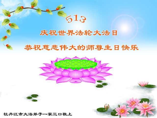 黑龙江省牡丹江市大法弟子一家三口恭祝师尊生日快乐!