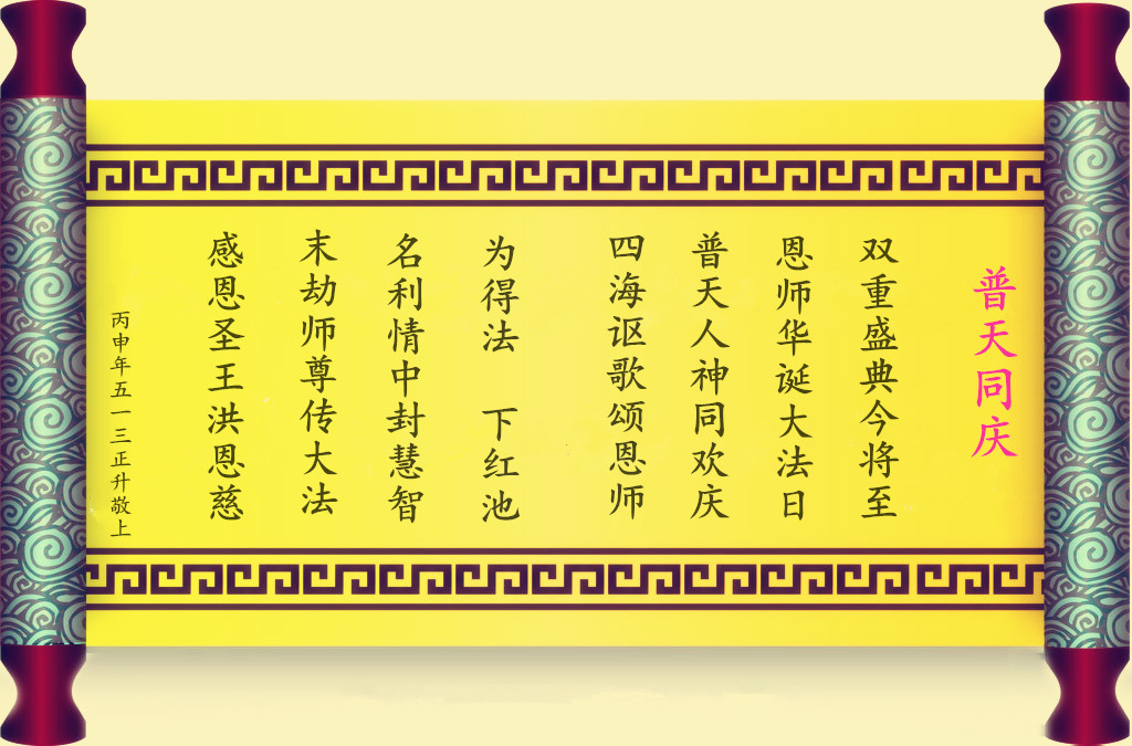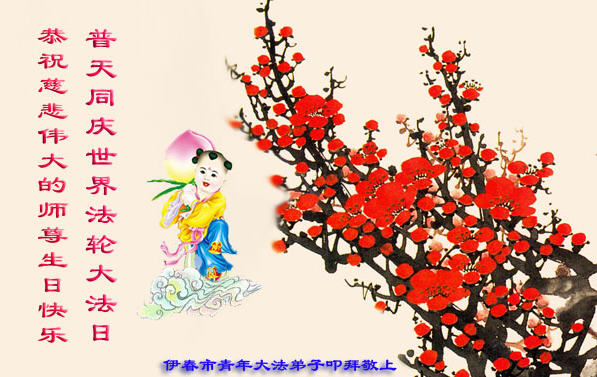 普天同庆 双重盛典今将至 恩师华诞大法日 普天人神同欢庆 四海讴歌颂恩师 为得法 下红池 名利情中封慧智 末劫师尊大法传 感恩圣王洪恩慈 黑龙江宝泉岭大法弟子丙申年奉上 黑龙江省伊春市全家大法弟子恭祝慈悲伟大的师父生日快乐!普天同庆世界法轮大法日!
