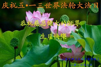 恭贺5•13第十七届法轮大法日暨师尊华诞! 师父您好,弟子一定要做到:听师父的教导,最大努力修去人心和执着,遇事向内找,做好三件事跟师父回家。恭祝师父生日快乐! 鞍山深沟寺三位大法弟子敬上 山东省淄博市沂源县一大法弟子恭祝慈悲伟大师尊生日快乐!庆祝世界法轮大法日!