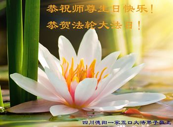 四川达州市大竹县大法弟子一家三口恭贺法轮大法日,恭祝师尊生日快乐!
