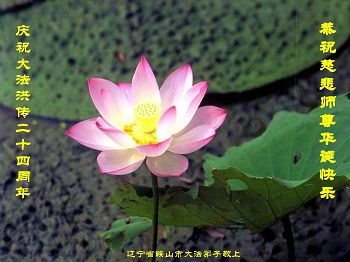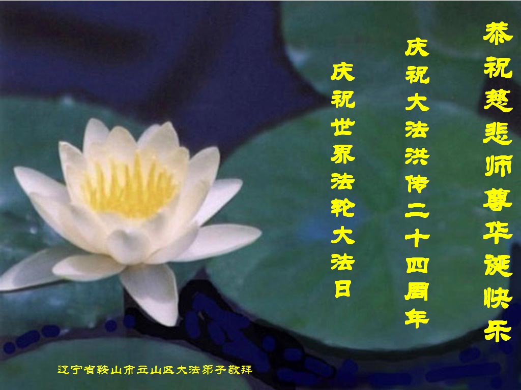 辽宁省鞍山市立山区大法弟子恭祝慈悲师尊华诞快乐! 庆祝大法洪传二十四周年 庆祝世界法轮大法日! 在这普天同庆的日子里,弟子叩拜师尊救度之恩。弟子一定把大法的福音传递给有缘人,兑现誓约,完成我的使命。 四川泸州大法弟子恭祝师尊生日快乐!