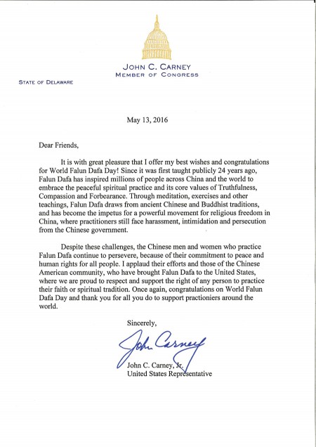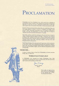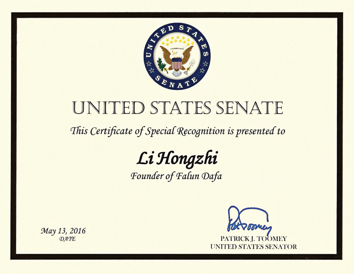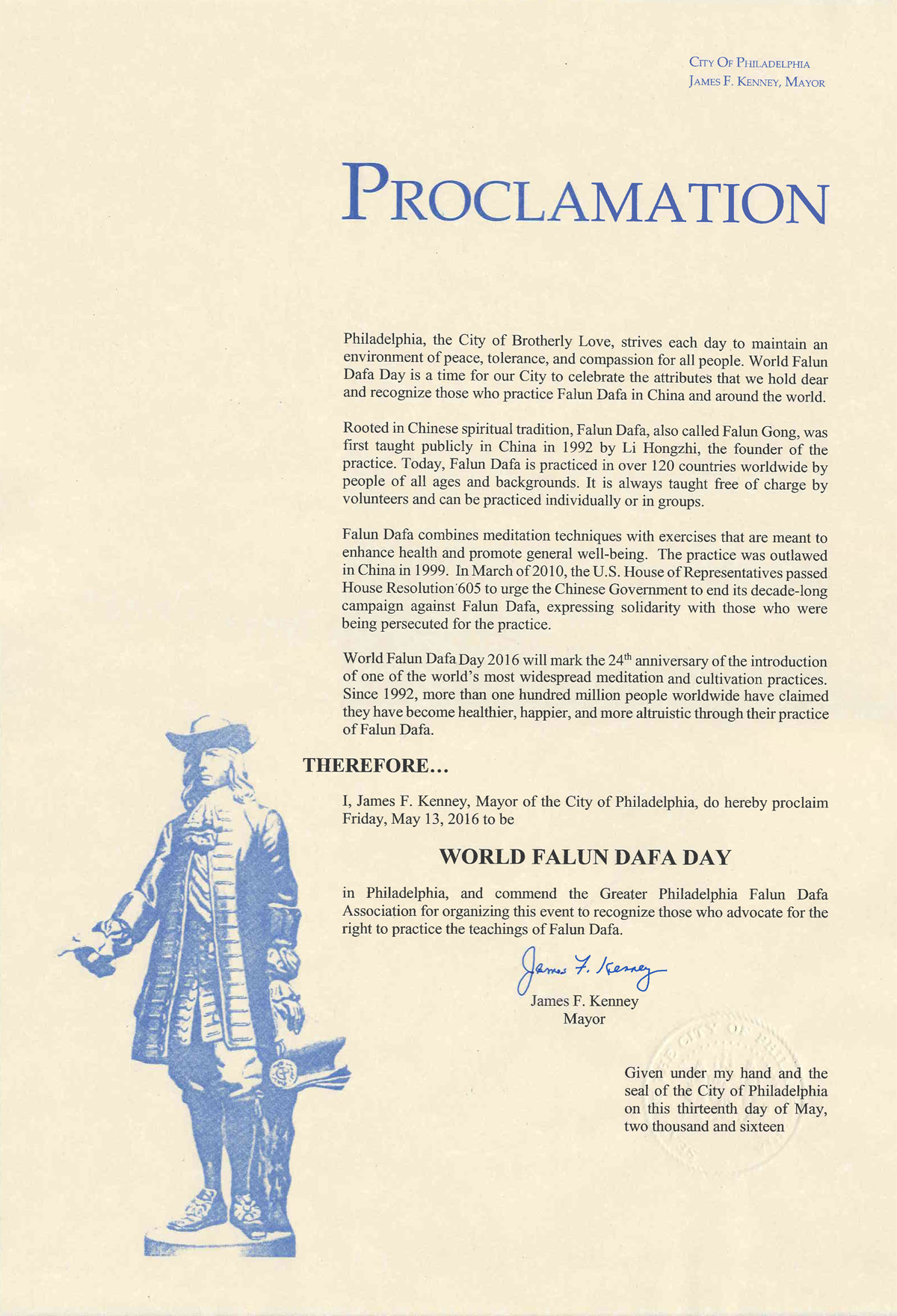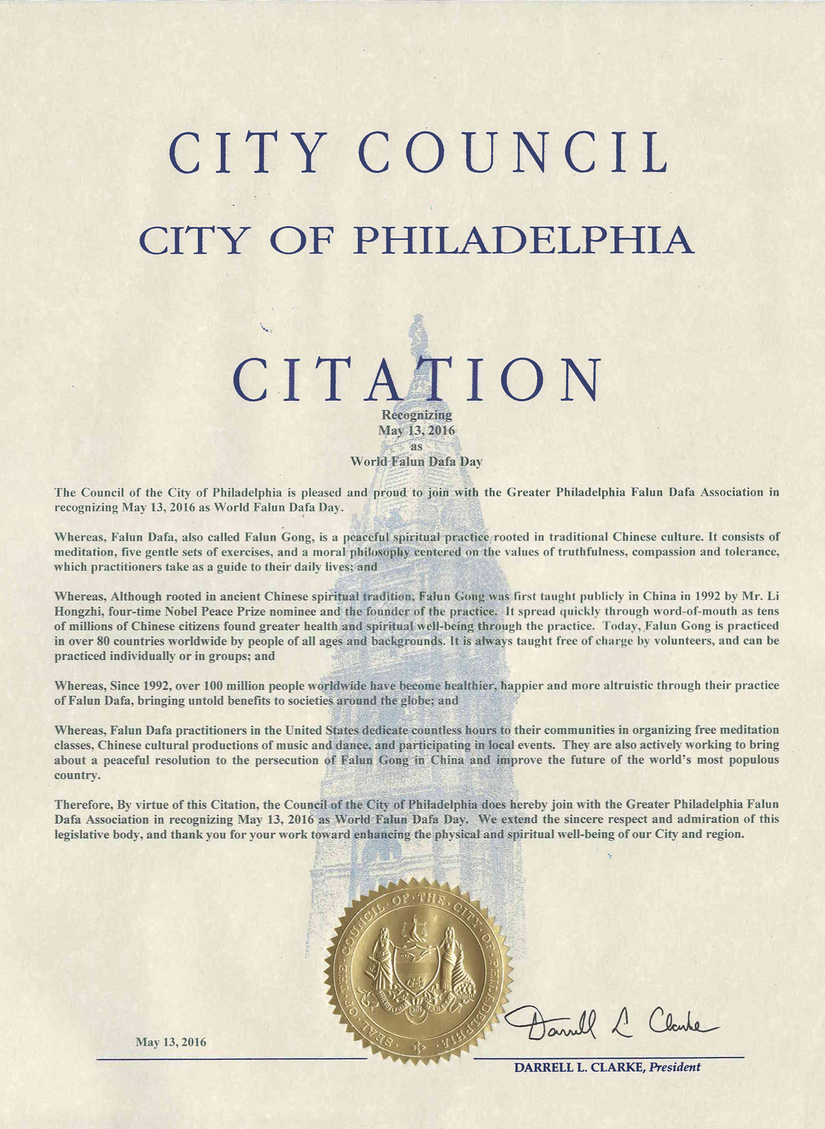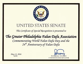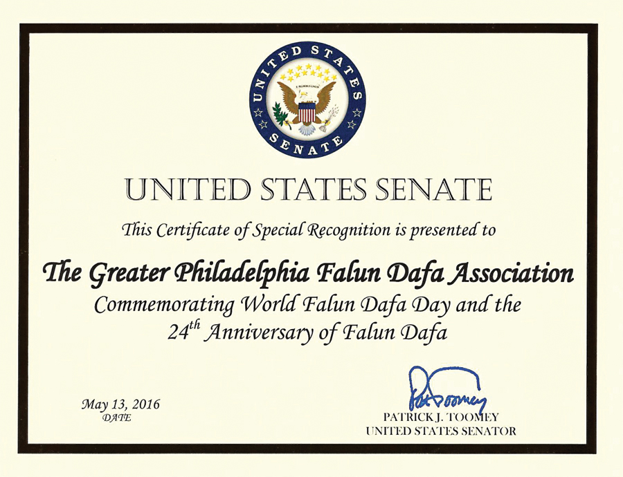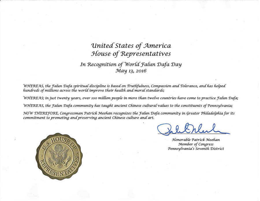 | 【明慧网二零一六年五月十二日】2016年5月13日是法轮大法弘传世界24周年暨第17届“世界法轮大法日”。在这个普天同庆的节日来临之际,宾州的美国国会参议员帕特里克•图米(Patrick J. Toomey)向法轮大法创始人李洪志先生和大费城法轮大法学会发来了表彰证书;宾州国会众议员帕特里克﹒米汉(Patrick Meehan)向大费城法轮大法学会颁发褒奖信,感谢法轮大法给宾州人民带来的福祉;德拉华州唯一一位美国国会众议员约翰.卡尼(John Carney),以及宾州参议院、费城市长近日也向大费城法轮大法学会发来褒奖和贺信,祝贺法轮大法日,盛赞法轮大法弘传世界。 以下是褒奖与贺信译文: 宾州的美国国会参议员帕特里克.图米(Patrick J. Toomey)给法轮大法创始人李洪志先生颁发的表彰证书。 美国国会参议院 特别褒奖证书颁发给法轮大法创始人——李洪志先生。 2016年5月13日 Patrick J. Toomey 美国国会参议员 宾州的美国国会参议员帕特里克.图米(Patrick J. Toomey)给大费城法轮大法学会颁发的表彰证书 美国国会参议院 特别褒奖证书颁发给大费城法轮大法学会; 祝贺世界法轮大法日纪念活动及法轮大法弘传24周年。 2016年5月13日 Patrick J. Toomey 美国国会参议员 美国国会众议员帕特里克·米汉的贺信 美国国会众议院 表彰世界法轮大法日 2016年5月13日 鉴于法轮大法是以真善忍为准则来提高身心健康的体系; 鉴于在过去的20多年里,全世界几十个国家有上亿人开始修炼法轮大法; 鉴于法轮大法群体将古老的中国文化带给了宾州境内的民众; 国会众议员帕特里克﹒米汉特此感谢大费城地区的法轮大法群体为弘扬与维护传统中国文化所作出的努力。 德拉华州美国国会众议员约翰.卡尼(John Carney)祝贺法轮大法日 美国国会众议院 John Carney 亲爱的朋友, 我非常高兴地表达我最诚挚的祝愿,祝贺法轮大法日!自从公开洪传24年来,法轮大法已经激励了中国和世界上成千上万的人拥抱这个平和的精神修炼和“真、善、忍”的原则。通过打坐、炼功和其他教诲,法轮大法吸取古老中国和佛法传统中的精华,已经成为在中国推动宗教信仰自由的原动力。然而,法轮大法修炼者在中国仍然受到中共当局的骚扰、恐吓和迫害。 尽管困难重重,但为了捍卫他们对所有人的和平及人权的承诺,中国的法轮大法修炼者仍然在坚持着。我为他们和那些把法轮大法传播到美国来的华人鼓掌。在美国,我们非常自豪地尊重和支持每个人行使信仰和精神传统的权利。再次祝贺法轮大法日,并且感谢你们为支持全世界的修炼者所做的一切。 宾州参议院褒奖法轮大法 2016年3月23日 鉴于,宾夕法尼亚州参议院非常自豪地表彰那些机构,他们以最高服务标准为建设更美好和更有成效的社区做出了有意义的贡献;并 鉴于,大费城法轮大法学会将在2016年5月13日于费城庆祝世界法轮大法日;并 鉴于,由李洪志先生于1992年5月创立的法轮大法,是一种高层次的身体、心灵和精神修炼,由包括打坐在内的五套祥和的功法组成,以及遵循真、善、忍的原则。自创立以来,法轮大法已经在全世界广为洪传,并在1998年传到费城。大费城法轮大法学会所提供的最高质量的服务已经获得公认,本着公平、值得信赖和廉正的原则,大费城法轮大法学会已经成为了一个社区领袖和值得效仿的楷模。多年来,该协会的组织者和成员为其成长和发展做出了巨大贡献。 鉴于此,宾州参议院与大费城法轮大法学会一起庆祝在费城举行的世界法轮大法日庆祝活动,并送上最美好的祝愿,预祝更成功地服务社区。 谨此,由州参议员Vincent Hughes起草的此褒奖呈送大费城法轮大法学会。 参议员 Vincent Hughes 第7参议区 费城市长颁发的褒奖 作为美国自由精神发源地的费城,市长詹姆斯•肯尼(James Kenney)颁发褒奖,宣布2016年5月13日为世界法轮大法日,赞扬法轮大法给该城市、宾州,以及全世界人民带来的福音。 肯尼于今年1月就职费城第99任市长。他在褒奖中写道:“费城,这一具有‘兄弟般友谊’的城市,每天都在为给所有人带来一个和平、容忍、慈善的环境而努力。在世界法轮大法日之际,我们愿意一起来庆祝这些理念,并且表彰中国和全球的法轮大法修炼者。” 褒奖中强调了法轮大法(也称法轮功)源于中国精神信仰的传统,并由创始人李洪志先生于1992年传之于世。现在全球有100多个国家的不同背景、不同年龄的民众修炼法轮大法。自愿者免费教功,方便于个人炼功或集体炼功。 “尽管法轮大法通过打坐等方式促进了人们的健康与整体生活,但在中国于1999年起遭到打压。美国国会众议院就此在2010年3月通过了605号议案,敦促中共政府停止10多年来对法轮大法的镇压,并愿意和那些受迫害的修炼者们站在一起。” 褒奖中表示,2016年法轮大法日将标志着全球这一最受欢迎的打坐与修炼方式传世24周年。自从1992年起,全世界已经有一亿多人从中受益,变得健康、幸福,与无私。 肯尼市长最后在褒奖中宣布:“作为费城市长,我特意表彰2016年5月13日为费城世界法轮大法日,并且感谢大费城地区法轮大法学会组办这次活动,来支持人们修炼法轮大法的权利。” 费城市议会祝贺世界法轮大法日 费城市议会也颁发褒奖,祝贺世界法轮大法日。褒奖中说: 费城市议会为能够和大费城地区法轮大法学会一起庆祝2016年5月13日世界法轮大法日而感到由衷地高兴。 鉴于法轮大法(又称法轮功)