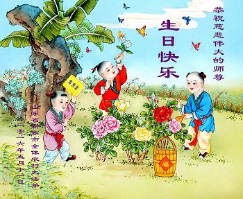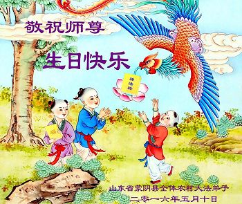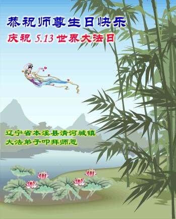 【明慧网二零一六年五月十二日】 辽宁省本溪县清河城镇一农村大法弟子恭祝师父生日快乐!庆祝世界法轮大法日!