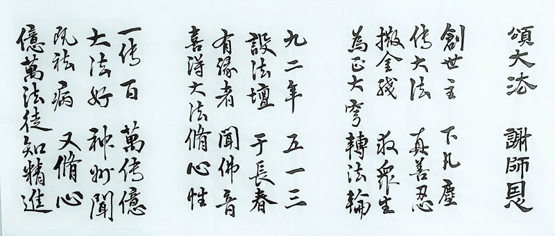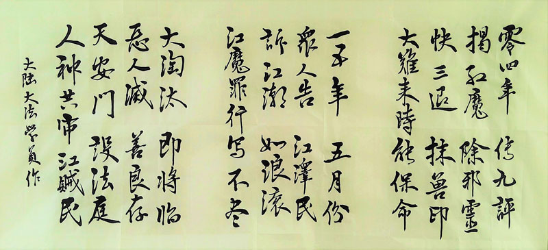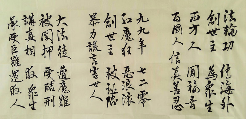 颂大法 谢师恩 创世主,下凡尘 传大法,真善忍 撒金线,救众生 为正大穹转法轮 九二年,五一三 设法坛,于吉林省长春 有缘者,闻佛音 喜得大法修心性 一传百,万传亿 大法好,神州闻 既祛病,又修心 亿万法徒知精進 法轮功,传海外 创世主,为众生 西方人,闻福音 百国人信真善忍 九九年,七二零 红魔狂,恶浪滚 创世主,被诬陷 暴力谎言害世人 大法徒,遭魔难 被关押,被判刑 讲真相,救众生 经受巨难还救人 零四年,传·九·评* 揭红魔,除邪灵 快三:退.,抹兽印 大难来时能保命 一五年,五月份 众人告,江泽民 诉江潮,如浪滚 江魔罪恶写不尽 大淘汰,即将临 恶人灭,善良存 天安门,设法庭 人神共审江泽民 四川德阳市一老年大法弟子恭贺法轮大法日!