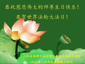 师父好! 师父生日快乐! 全世界大法弟子共同庆祝世界法轮大法日 师父您辛苦了,弟子感谢师父慈悲救度! 在今后的修炼中,我会多学法,做好大法弟子该做的,跑步跟上正法進程。 山东省烟台市芝罘区大法弟子 烟台明白真相的大法弟子家人在这里祝师父好!祝师父生日快乐!师父辛苦了!感激师父的大法,让我在人生的路上不再迷惘,让我不被这个乱七八糟的社会污染,让我有了坚定的信念,知道自己应该做什么,什么绝对不可以做。我老贪玩,没有走上修炼的路,可是我也总是用大法来归正自己的行为,就是我这样不认真的态度,师父也还是在我有困难的时候,身体不舒服的时候,显示神迹,再难过的时候,一看到师父您的照片心里就一片安宁。感恩师父,您真的太辛苦了,您给予我的太多太多。希望这种辛苦的日子早日结束。希望早日在中国大陆见到师父见到神韵演出。