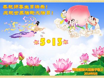 【明慧网二零一六年五月十二日】 河南省南阳市社旗县全体大法弟子恭祝师父华诞!
