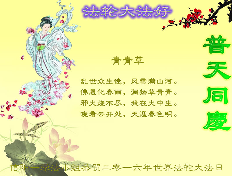 青青草 乱世众生迷,风雪满山河。 佛恩化春雨,润物草青青。 邪火烧不尽,我在火中生。 晓看云开处,天涯春色明。 河南省许昌大法弟子恭祝慈悲伟大的师尊生日快乐!