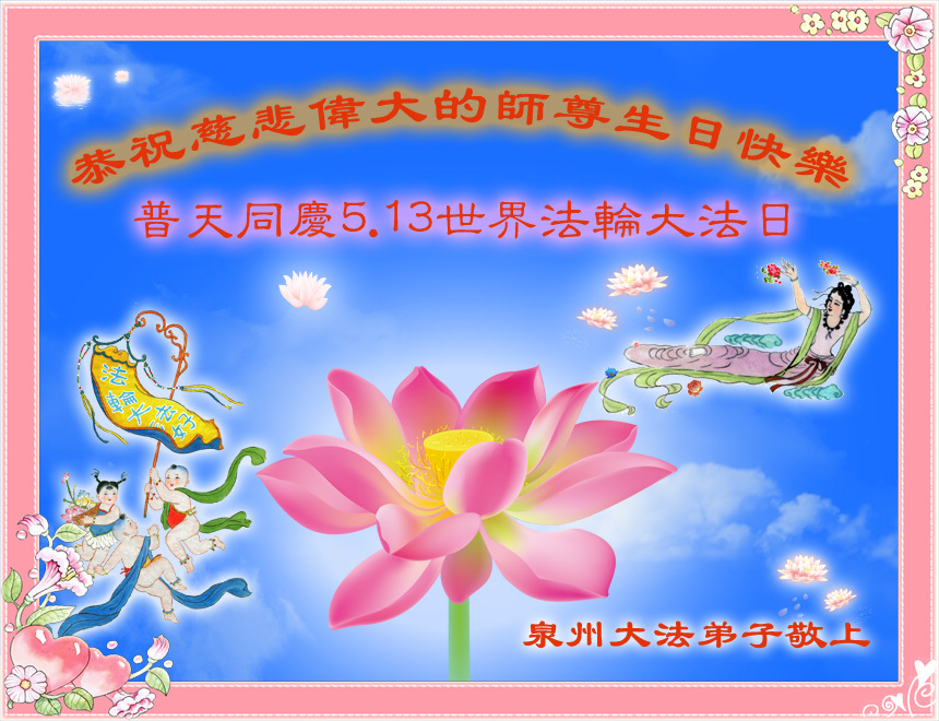 广东东莞一女大法弟子 福建厦门一女大法弟子 恭祝 福建省泉州市大法弟子恭贺世界法轮大法日!