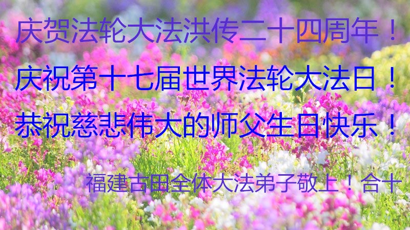 庆贺法轮大法洪传二十四周年,庆祝第十七届世界法轮大法日,恭祝慈悲伟大的师父生日快乐! 福建省新罗区大法弟子恭祝李洪志师父生日快乐!