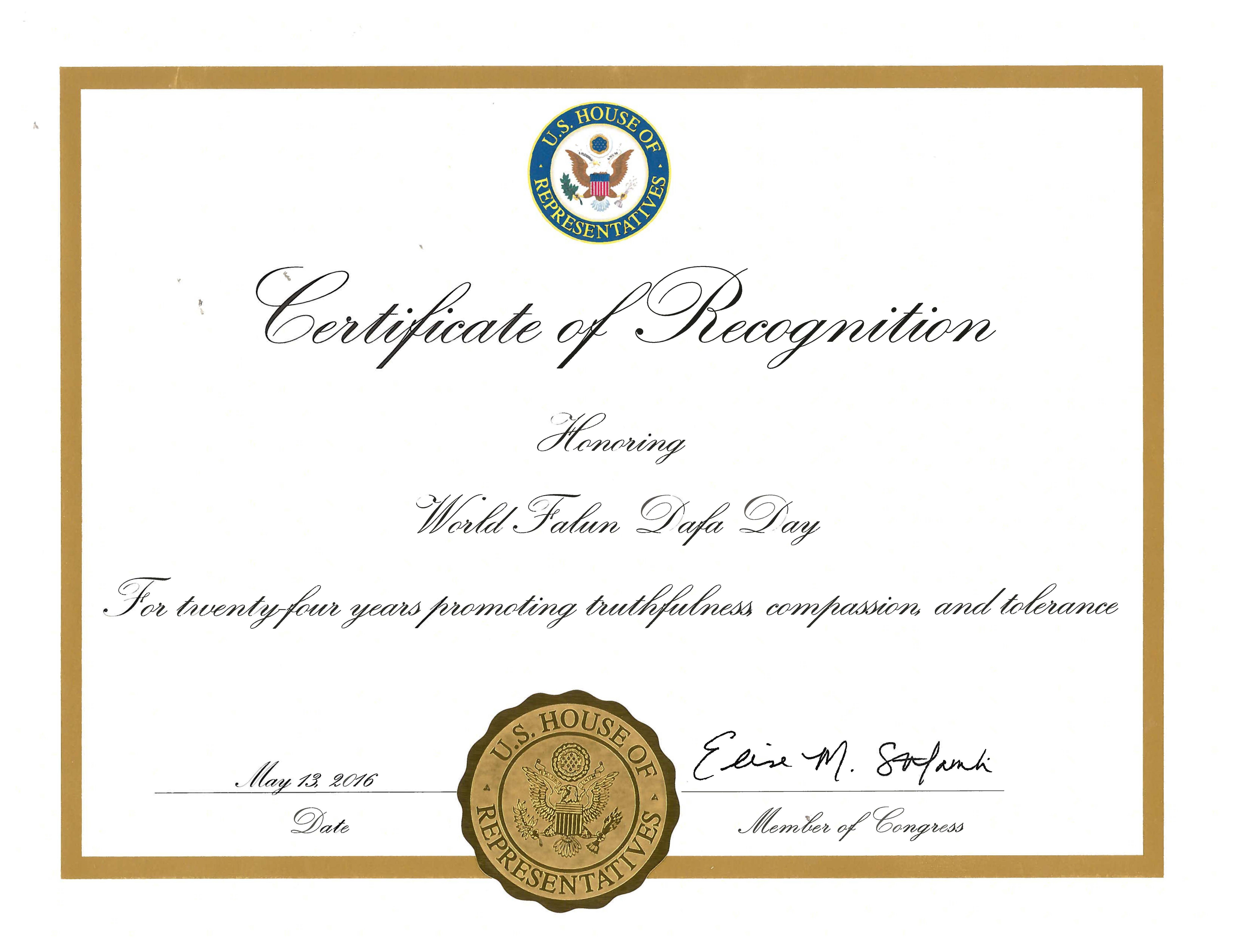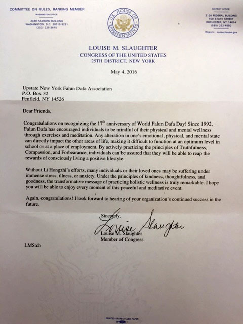 纽约州第十三选区国会议员Charles Rangle 也发来褒奖状,陈述如下: 鉴于,世界法轮大法日是庆祝有五千年古老文明沉淀的“真善忍”这个普世价值。在西方人的眼里,法轮大法是一种宗教和一种特别的信仰。其实,在古老的中国文明中,自我的修炼被整个社会所认知。她已经超越了一群人的一种宗教练习,而是五千年文明所拥有的一种生活方式。中国传统强调精神上的自我修炼和对神的崇敬,并把这一切溶于生命中和日常生活中。这种精神觉醒不仅仅是只有和尚,而是体现在社会各阶层,包括官员,医生,农夫等等。 法轮大法,也叫法轮功,是一种精神传统。他的法则是“同化宇宙最高特性——真善忍,这是他的根本。”“富贵不能淫,贫贱不能移,威武不能屈”。这是古代中国人的标准。然而,在中共的铁拳下,经历了天安门大屠杀和各种残酷的政治运动,现代中国人在中共歪理的灌输下过着完全不同于古人的生活“人为财死,鸟为食亡。”中国人曾经引以为傲的文化之根被破坏了,太多的现代中国人生活的目的只是为了赚钱。 当法轮功学员面对一九九九年七月发起的残酷迫害,他们必须在“放弃良心还是保持尊严”中选择。面对酷刑折磨,监狱,停发工资,失去工作,公共的羞辱,他们选择坚守他们的信仰。就这样他们坚持了十五年,帮助更多的中国人重新认识尊严和慈悲,对正义善良重新升起信心。法轮大法在六大洲七十多个国家都有传播,法轮大法的书籍被翻译成三十多种文字。她用古老的智慧平和的尊严把各个文化背景的现代人联系在一起。“真善忍”是普世价值,应该庆祝。能够见证这普世价值被世界认识是一种荣耀。庆祝这普世价值更是值得珍惜。 因此,我,Charles Rangle,纽约州第十三选区的国会议员,宣布五月十三日,二零一六年,是“世界法轮大法日”  图10:纽约州第二十五选区国会议员Louise Slaughter为“世界法轮大法日”发来贺信 |