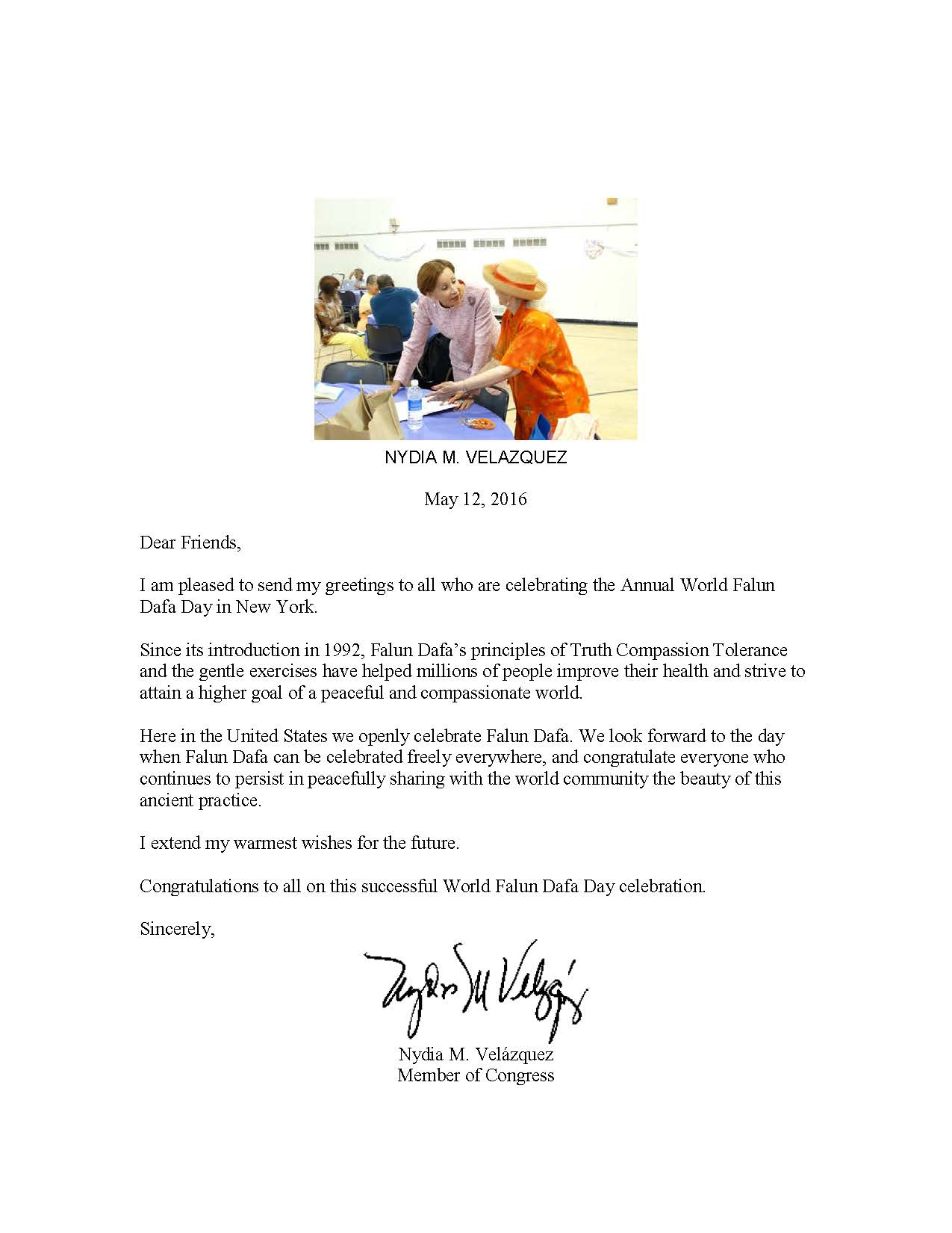 纽约州第一选区国会议员 Zeldin Lee,第十九选区国会议员 Chris Gibson和第二十一选区国会议员 Elise Stefanik 都发来证书庆祝“世界法轮大法日”,以此表彰法轮功学员对社区的杰出贡献。  图4:纽约州第七选区国会议员 Nydia Velazquez 在贺信祝贺世界法轮大法日。 |