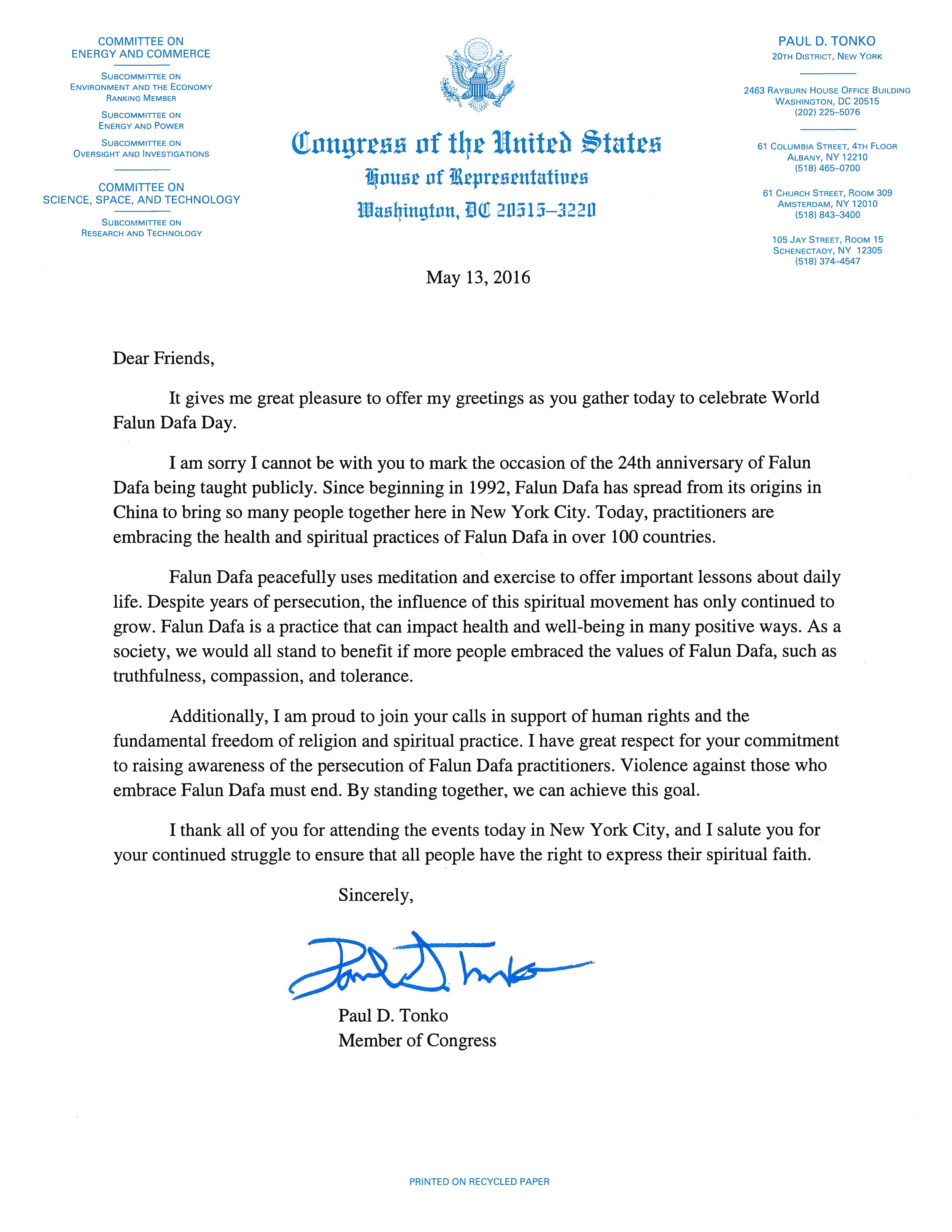 纽约州第十一选区国会议员 Daniel Donovan在贺信中祝贺“法轮大法洪传二十四周年,面对邪恶,法轮大法依旧以一种平和的方式传播到世界各地。”并骄傲的支持“法轮大法修炼者以音乐和舞蹈的方式把古老的中国智慧和精神传统传播到世界各地。”  图7:纽约州第二十选区国会议员 Paul Tonko为“世界法轮大法日”发贺信 |