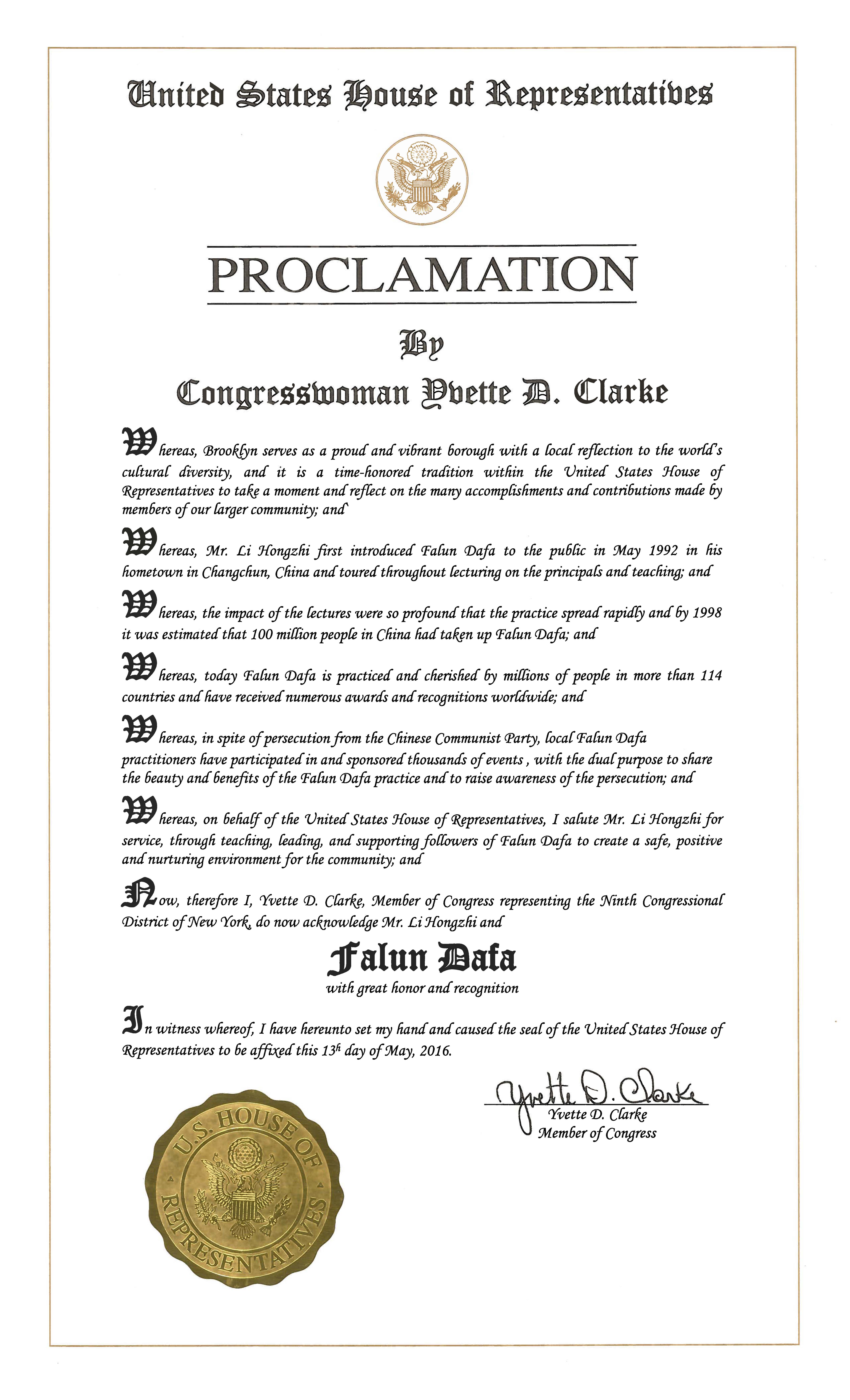 纽约州第二十选区国会议员 Paul Tonko也发来贺信,赞扬“法轮大法提升人的健康和生活品质,‘真善忍’是人类受益,社区更加美好。”,并强调“迫害必须停止。”  图8:纽约州第九选区国会议员Yvette Clarke颁发的褒奖状 |