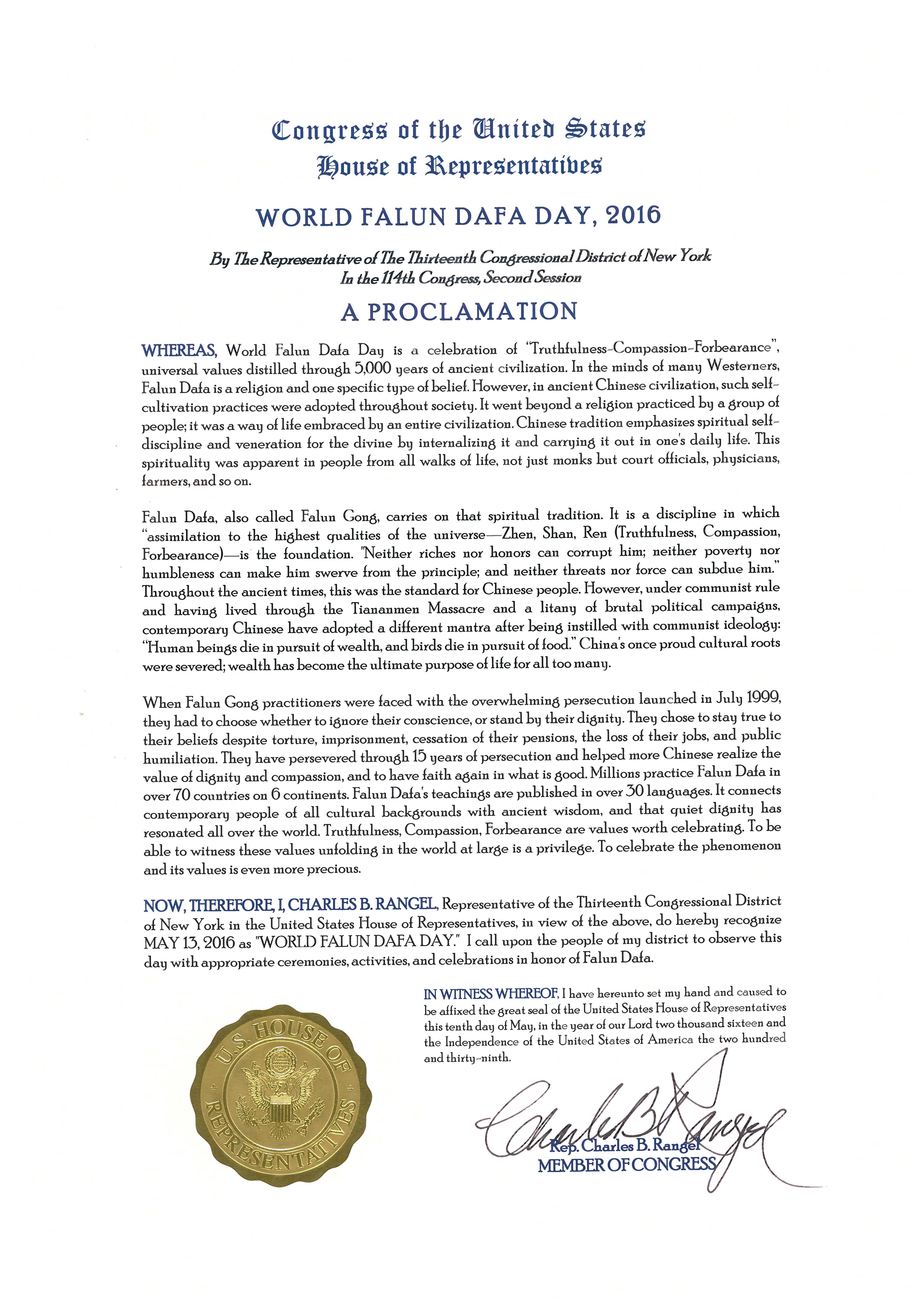 纽约州第九选区国会议员Yvette Clarke发来褒奖状,陈述如下: 鉴于,法轮大法由李洪志先生首次于一九九二年的五月在他的家乡长春公开传出,之后李先生亲自到各地讲法教功; 鉴于,李洪志先生传法的影响非常深远,法轮大法迅速传播开去,到一九九八年,估计在中国有一亿人在修炼法轮大法; 鉴于,现在法轮大法被一百一十四个国家数以百万计的人们修炼和珍惜,并获得了世界各地无以数计的褒奖; 鉴于,尽管中共的迫害,法轮功学员还是举办了各种各样的活动,完全是为了分享大法的美好和告诉人们迫害的真相; 鉴于,我代表美国国会议员,向李洪志先生致以敬礼,表彰他的杰出奉献,通过他的教导和领导,以及他的法轮功学员们,帮助建立一个安全积极丰富的社区环境; 因此,我,Yvette Clarke,纽约州第九选区的国会议员,表彰李洪志先生和法轮大法。  图9:纽约州第十三选区国会议员Charles Rangle 为“世界法轮大法日”颁发褒奖状 |