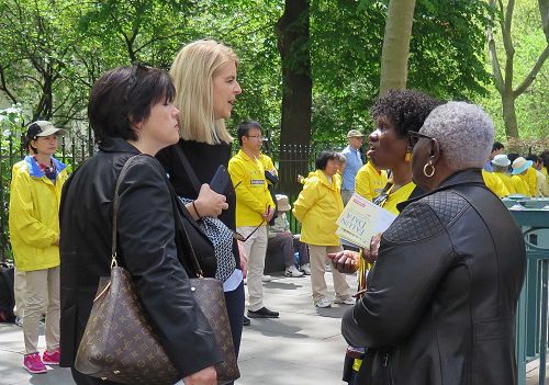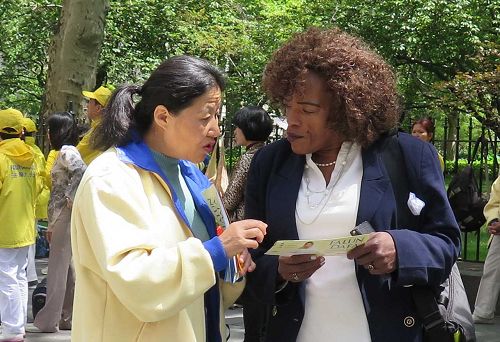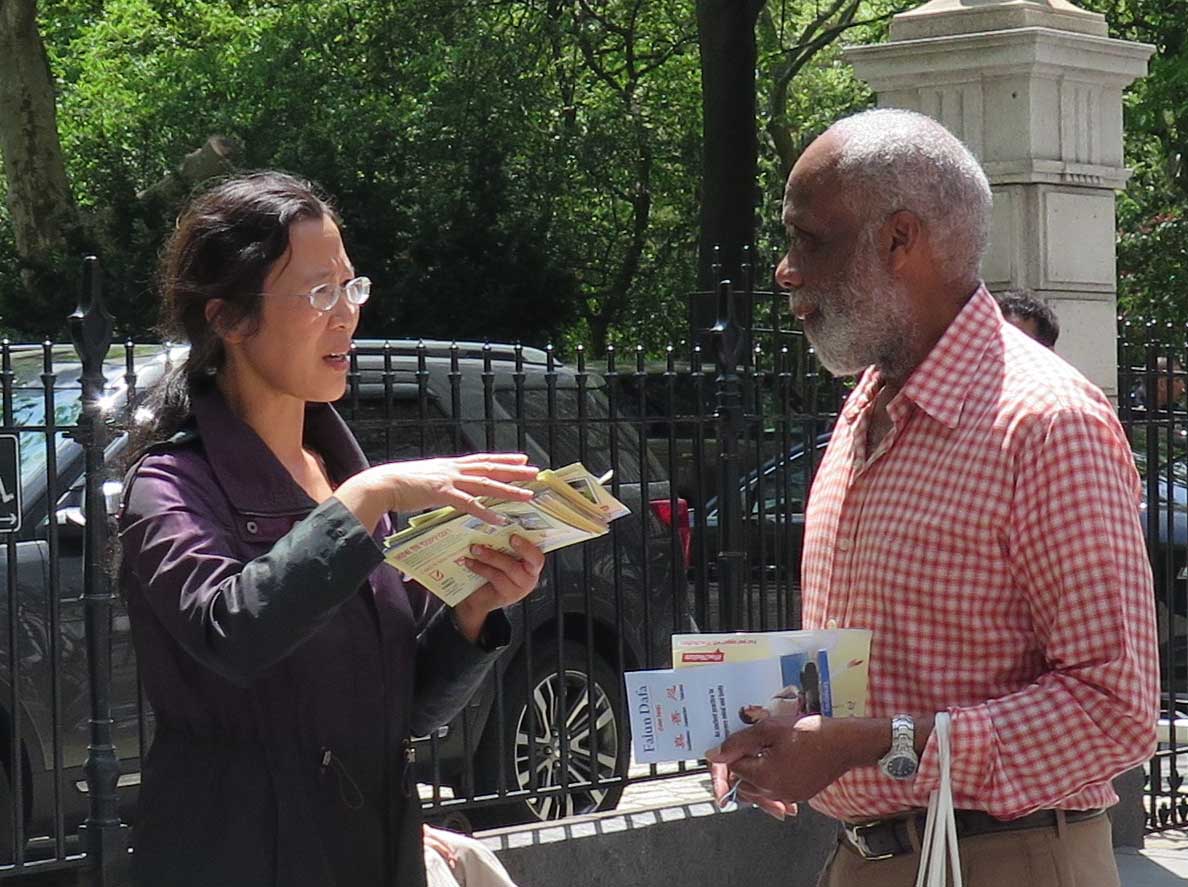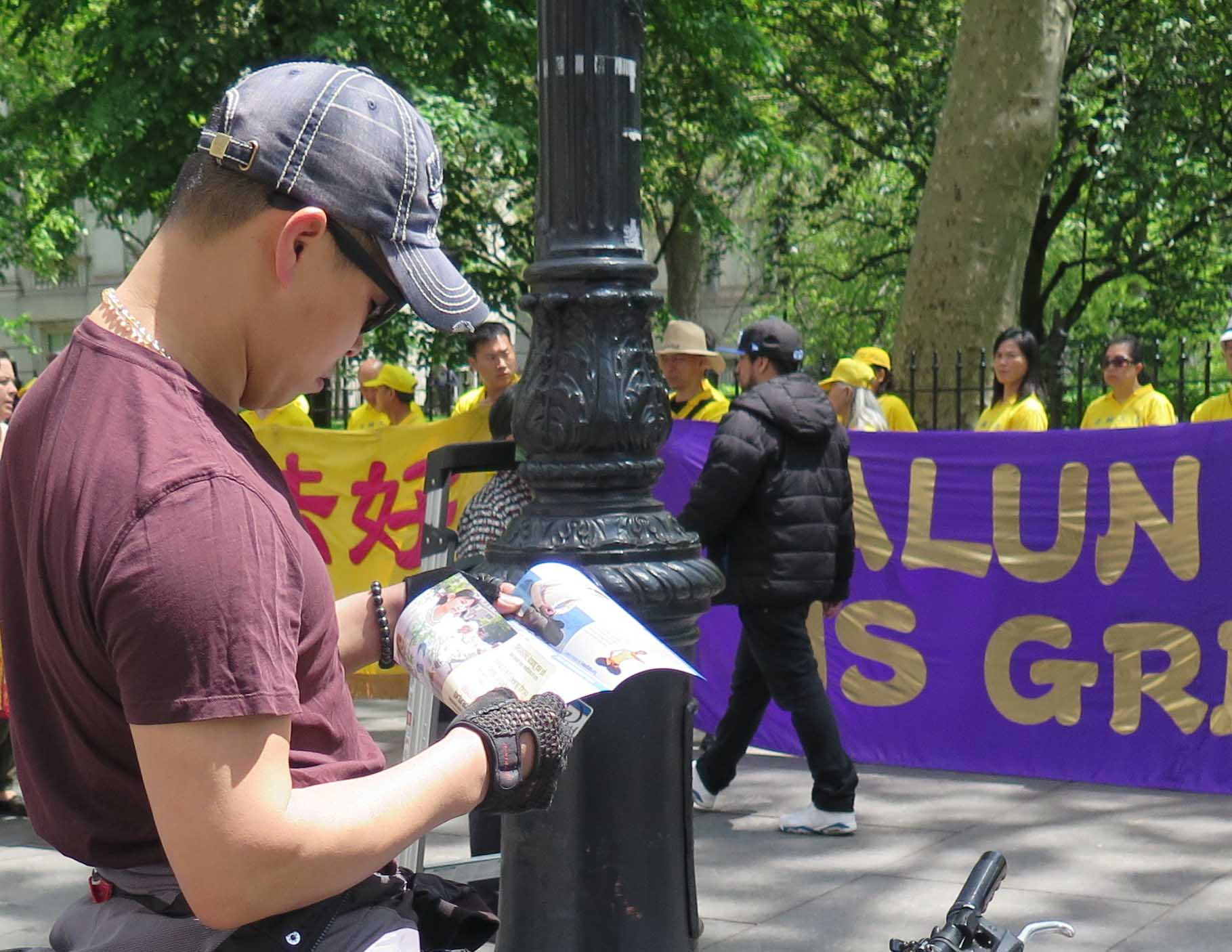 今年四十四岁的胡志明先生,曾为北京空军司令部军训器材研究所少校军官。他在一九九七年开始修炼法轮功。中共开始迫害法轮功时,胡志明先生希望通过给政府及民众讲真相,帮助人们了解法轮功。为此他在一九九九年至二零零五年期间三次被抓,两次被非法判刑,前后共被非法关押八年。 胡志明先生回忆道:“在二零零零年至二零零四年上海提篮桥监狱被非法关押期间,被打骂是家常便饭,到后来发展到不让我睡觉。只要一合上眼就会被打醒。”二零零四年八月,胡志明开始绝食以维护自己的权益。由于过度的虚弱,他很快陷入昏迷,他被送去监狱医院后,情况并没有得到好转:“我的四肢被抻开绑着,胸前还有一道绳索,死死固定在床上,大小便一直在床上。鼻子里插着一根管子灌食,同时还往他身体里输入不明药物。” 就这样胡志明先生被绑在床上一个多月,直到十月他刑满出狱。那时胡志明的双腿已呈半瘫痪状态,和以前判若两人。 二零零五年九月他被再次被投入监狱,这一次他被折磨得内脏严重受损,右腿的神经器质性损伤,医生曾断言他非死即残。 最后他说:“在这个喜庆的日子里谈这些悲伤的往事,对我来说这已经过去,对很多与我有着同样信仰的人,却正在承受着。”最后他呼吁:“这种反人类的罪恶,我们要共同抵制,共同揭露!” 谴责中共迫害法轮功 民众支持法轮功反迫害 法轮功学员举办的新闻发表会吸引许多路人驻足聆听。马克·奎格利(Mark Quigley)先生是其中一位,他说:“中共迫害法轮功毫无道理,没有任何意义!” 奎格利先生曾是大纽约地区一家保险公司的副总裁兼精算师。恰好昨天他的一位朋友告诉他刚刚了解到的法轮功学员在中国遭到迫害的事。他很高兴当天就在去健身的路上看到了法轮功学员的新闻发布会。他拿了法轮功真相资料后说:“我要拿给我的朋友看。”临走前他对法轮功学员说:“我支持你们,这(告诉人们真相)是一件好事!” 张先生从中国大陆来纽约的时间不长,并计划在纽约住一到两年。他观看了新闻发布会和聆听了法轮功学员所讲述的遭受迫害的经历后说:“在过内听不到迫害的事,特别是活摘法轮功学员器官的事根本就听不到。出国后才了解到的。我经常看大.纪.元;报。”在短暂停顿后他接着说:“活摘人的器官不可思议,不是人做的事!”  图17:埃里克·拜尔默(Eric Bymel)表示,支持法轮功学员持续和平反迫害,传播真相。 |