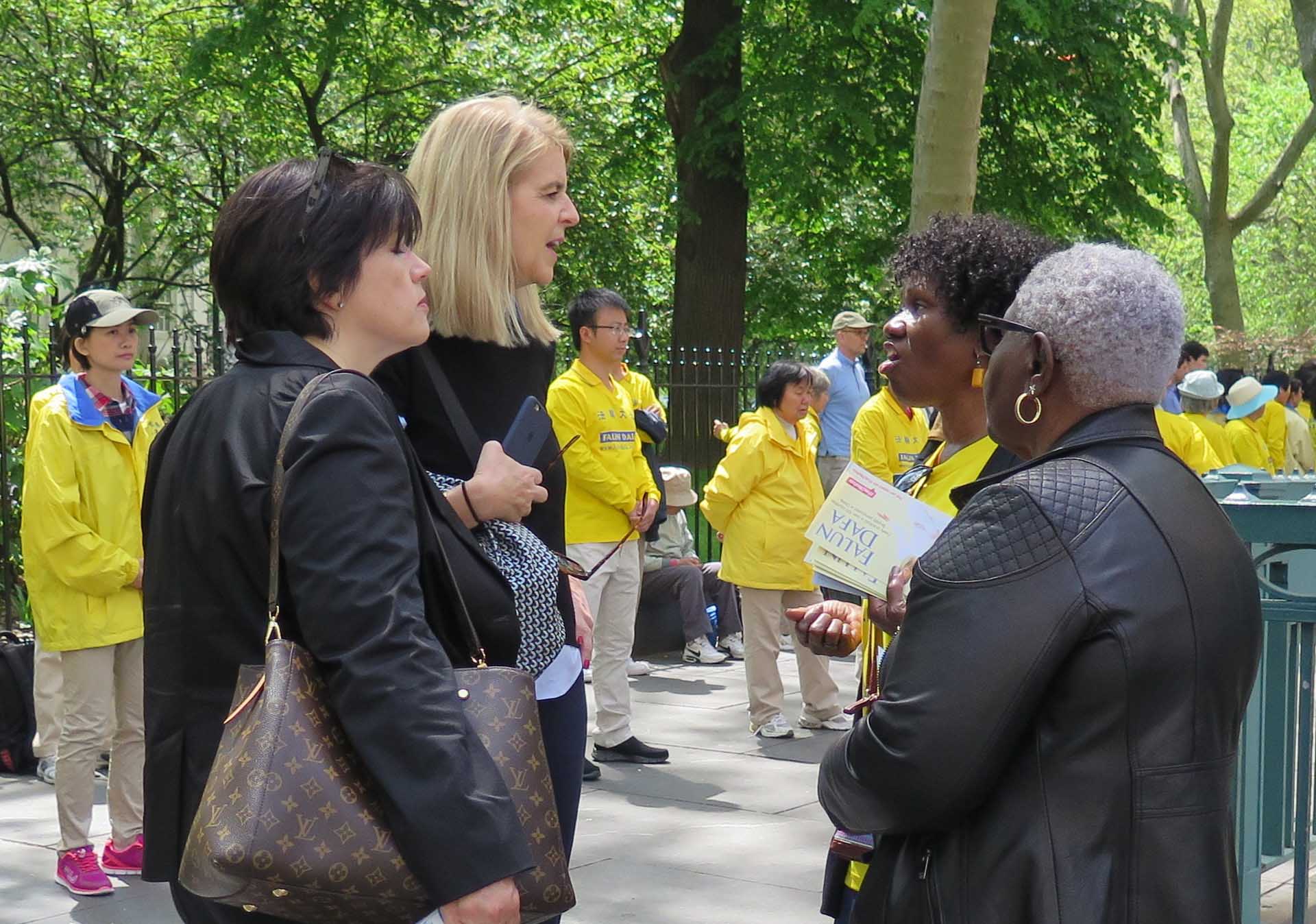 图12-15:法轮功学员举办的新闻发布会吸引过往路人驻足了解真相。 |