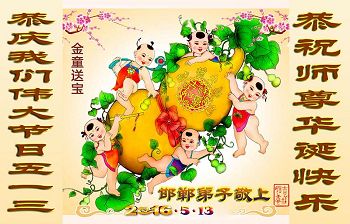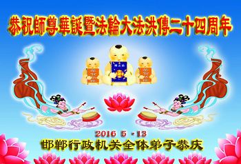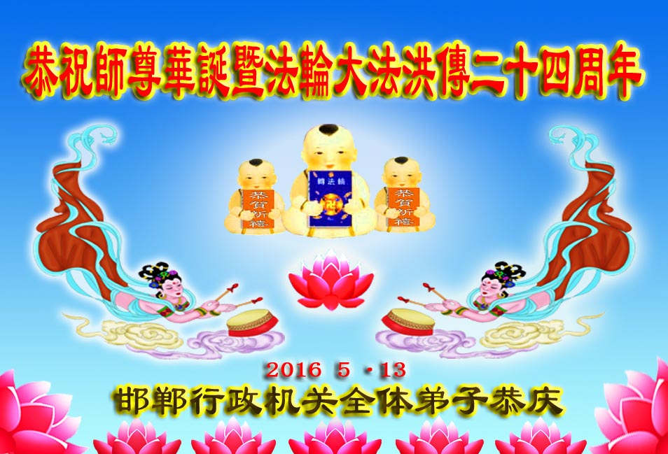 恭贺5.13第十七届全世界法轮大法日!庆贺法轮大法洪传全世界二十四周年! 师尊啊!您辛苦了!师尊给予我们的太多太多,想起师尊的辛苦,弟子们心里非常难过,师尊只为我们承受付出,什么都不求我们,师尊的慈悲,师尊恩泽,用尽人间的语言道不尽,千言万语,万语千言汇成一句话:信师信法不打折扣勇猛精進,用好师父赐予我们向内找的法宝,修好自己多救人,让慈悲的师父少一些操劳,让伟大的师父放心开心。 弟子们跪拜恩师! 河北省邯郸大法弟子庆祝五一三世界法轮大法日暨恭祝师尊华诞!