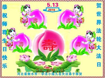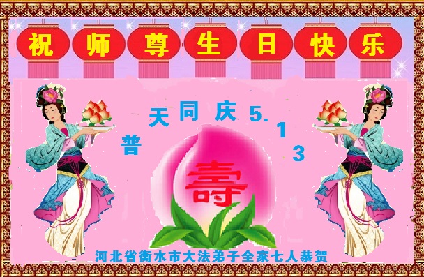 【明慧网二零一六年五月十三日】 河北省衡水市一大法弟子全家七人恭祝慈悲伟大的师尊生日快乐!