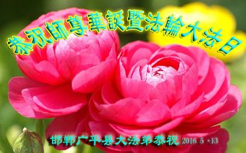 恭祝慈悲伟大的师尊六十五岁华诞生日快乐!普天同庆、同祝、同颂大法洪传世界二十四周年。 弟子无限感恩师尊的慈悲救度,弟子一定努力做好三件事,走好师尊安排的修炼之路,直至法正人间,跟师尊回到自己真正的家园。 河北涿鹿大法弟子隔洋跪拜 2016年5月6日 河北省邯郸市广平县大法弟子恭祝师尊华诞暨庆贺法轮大法日!