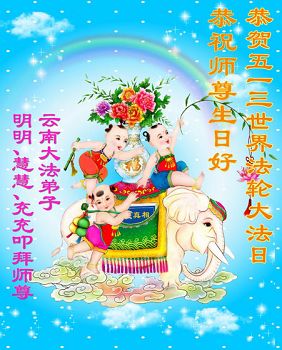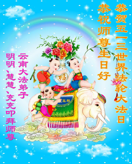 云南三位大法弟子恭贺世界法轮大法日!恭祝师尊生日好!