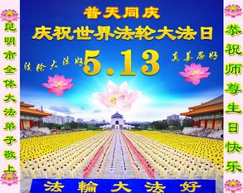 云南昆明大法弟子恭贺世界法轮大法日!恭祝师父生日快乐!
