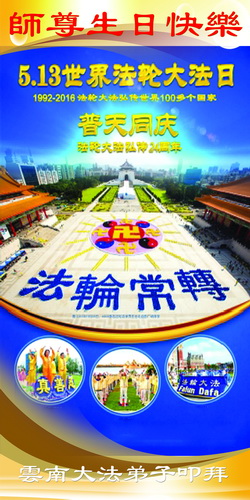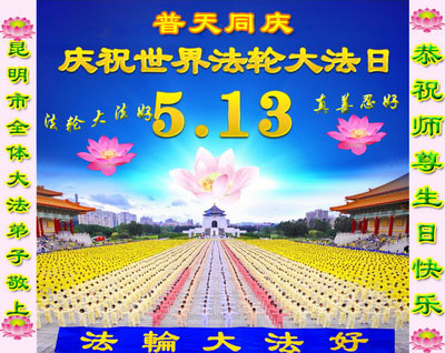 云南昆明市全体大法弟子恭祝慈悲伟大的师尊生日快乐!庆祝世界法轮大法日暨大法洪传二十四周年!