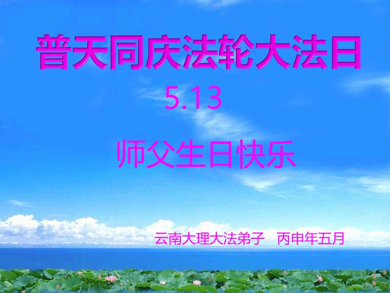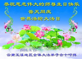 【明慧网二零一六年五月十三日】 云南省大理州大理市大法弟子普天同庆法轮大法日!恭祝师父生日快乐!