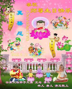 云南昆明市一大法弟子全家恭祝慈悲伟大的师尊生日快乐!普天同庆世界法轮大法日暨大法洪传二十四周年!